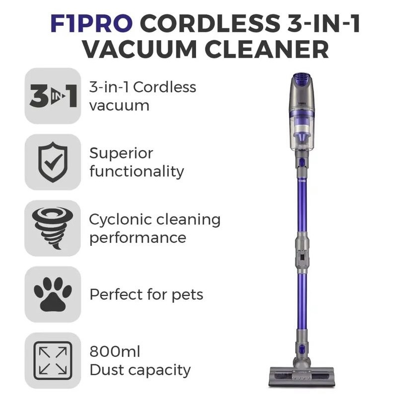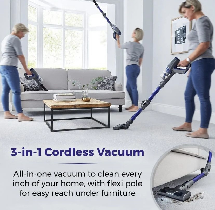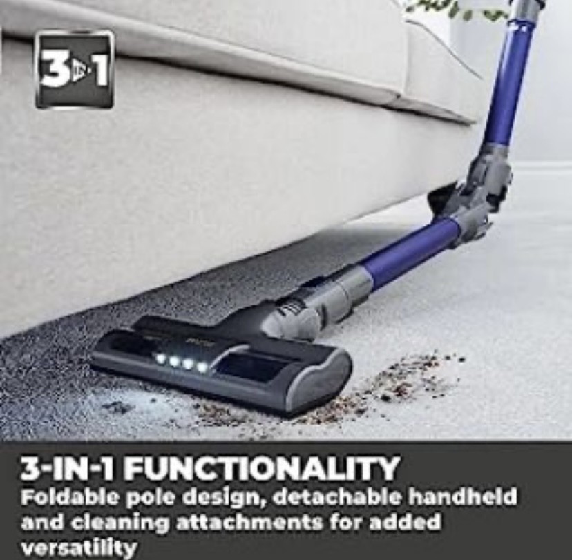 The 140W motor of our Tower 3-in-1 cordless vacuum cleaner powers effective cleaning throughout the house.A foldable telescopic tube with the 3-in-1 design offers versatility when cleaning above high cabinets and behind furniture. The handheld is lightweight and removable, making it ideal for tight spaces. The brush head attachment and crevice tool are great for cleaning upholstery and stairs. A five-hour charge can last up to 55 minutes on a rechargeable battery. For a cleaner home, the mesh filter collects the tiniest dust and debris particles