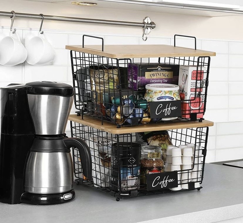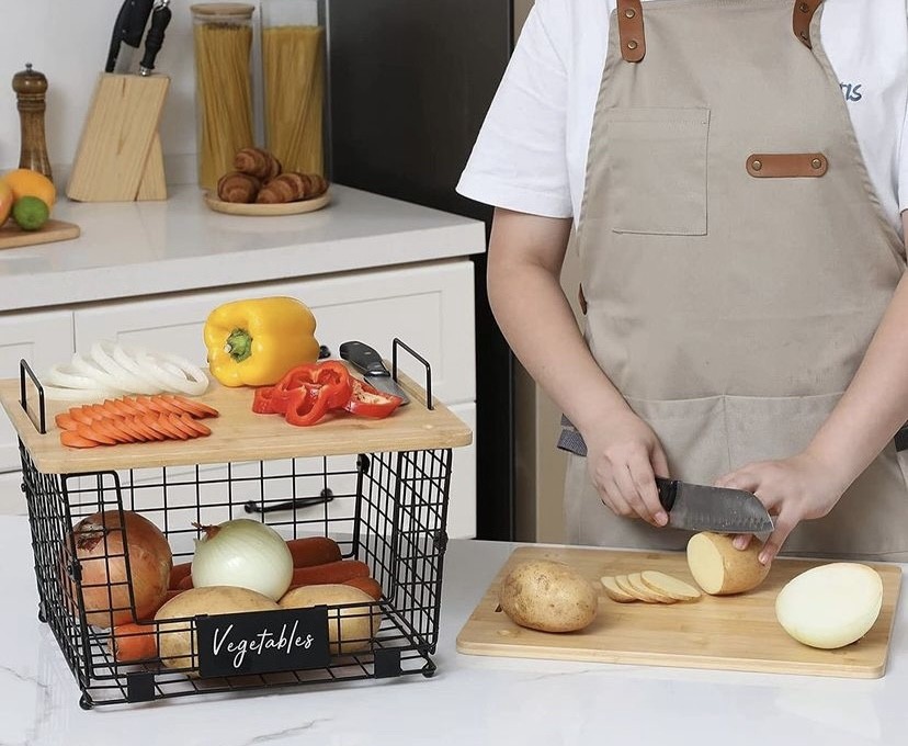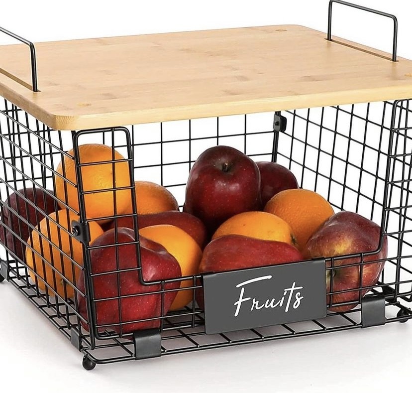 Mesh storage basket with wooden lid