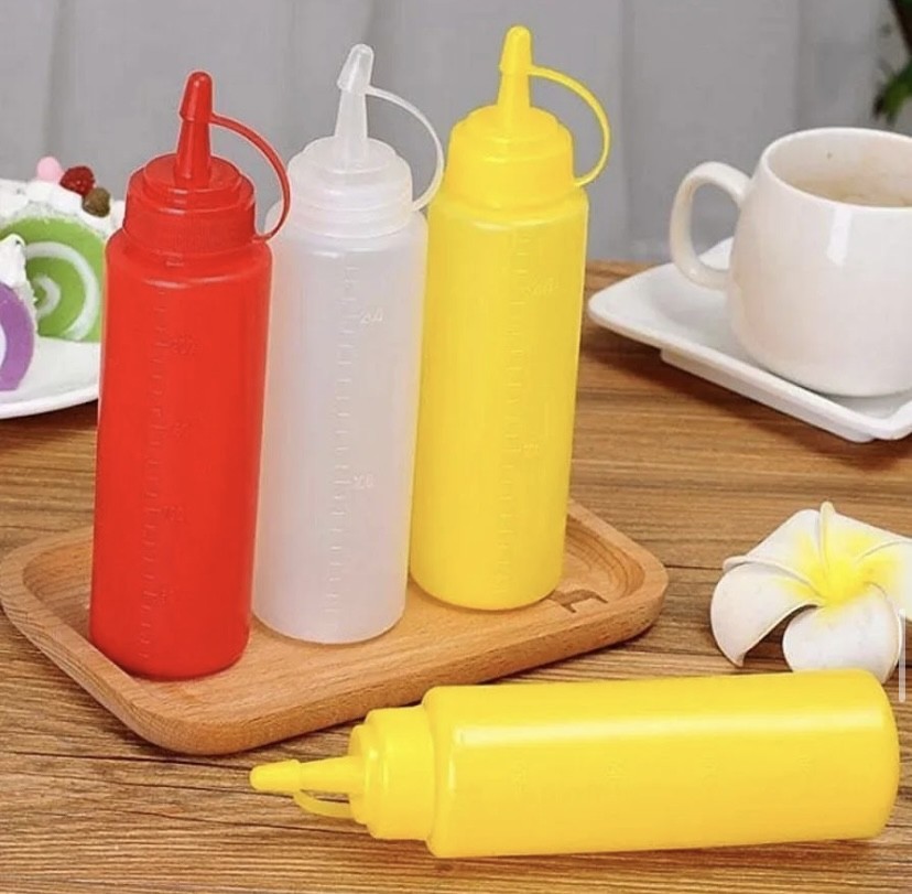 For ketchup, mayonnaise, salad cream, oil, hot sauce, pancake mix.