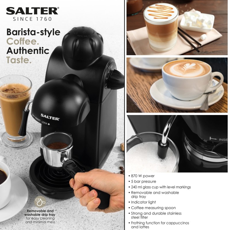 Salter EK3131 Espressimo Coffee Machine - 4-Shot Espresso Maker, Milk Frothing Wand, Includes 240 ml Glass Carafe, Barista Style Latte And Cappuccino, 5-Bar Pressure, Stainless Steel Filter, 870W